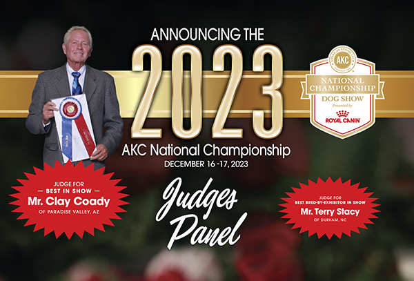 Leading the charge as Best In Show judge for the 2023 National Championship is Mr. Clay Coady of Paradise Valley, AZ and Mr. Terry Stacy of Durham, NC will judge Best Bred-by-Exhibitor in Show. The judges for Junior Showmanship, the National Owner-Handled Series Finals and the AKC Royal Canin National All-Breed Puppy and Junior Stakes will be announced at a later date.