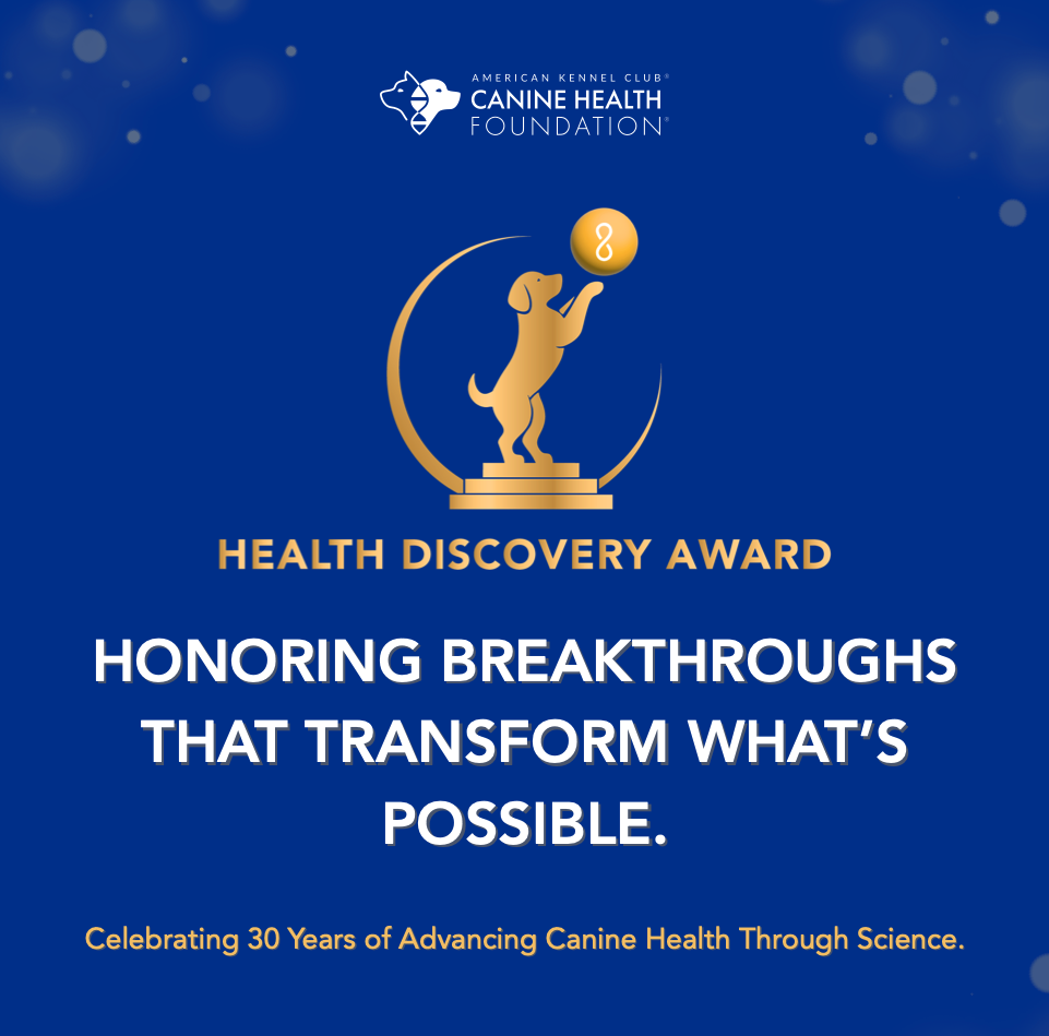 The Canine Health Discovery of the Year Award sets out to annually honor the most significant research advancement that transforms the health and well-being of dogs, with $75,000 in potential research funding and a $10,000 cash prize going to the winner.