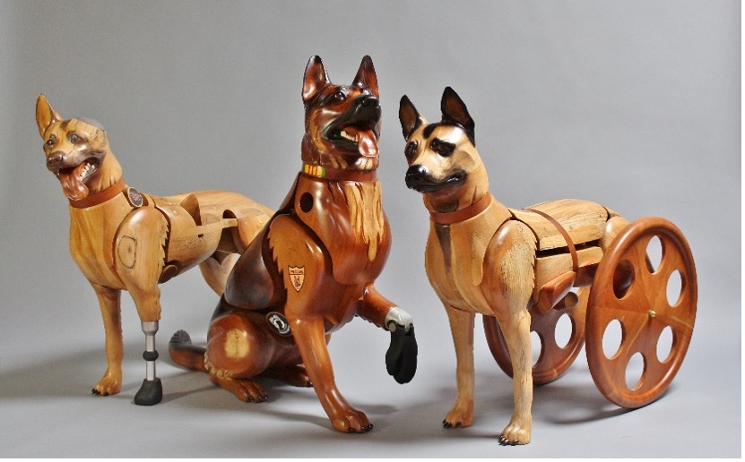 New York, NY – The AKC Museum of the Dog is pleased to announce the opening of a new exhibit, “Dogs of War and Peace,” open March 16 through July 19, 2022. Ten life-sized, carved-wood allegorical memorials by sculptor James Mellick will be on display from his “Wounded Warrior Dogs” and “Over the Rainbow Bridge” collections, along with the museum’s permanent collection, which includes sculptures, paintings, collars, vests, photographs and more.