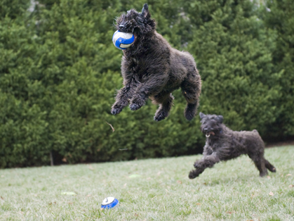 Once puppyhood is past, the Bouvier can be counted on to take up space on the sofa. Or lie quietly in a doorway, facing out, to protect his family. But, every now and then he will get it into his head to exercise on his own by doing butt tucks at full throttle around the yard. Also, Bouviers play hard employing body slams and open mouth play fights. Should you happen to be in the yard while this is occurring, pay special attention. At some point this speeding locomotive of a canine will spot you. There is a moment of eye contact between the two of you. At this point, you know you’re the target. The Bouvier will hurtle your way and either slam into your knees or, as you turn sideways to avoid the collision, he will leave the ground and fly by you at eye level nipping the soft flapping flesh of your underarm as he goes.