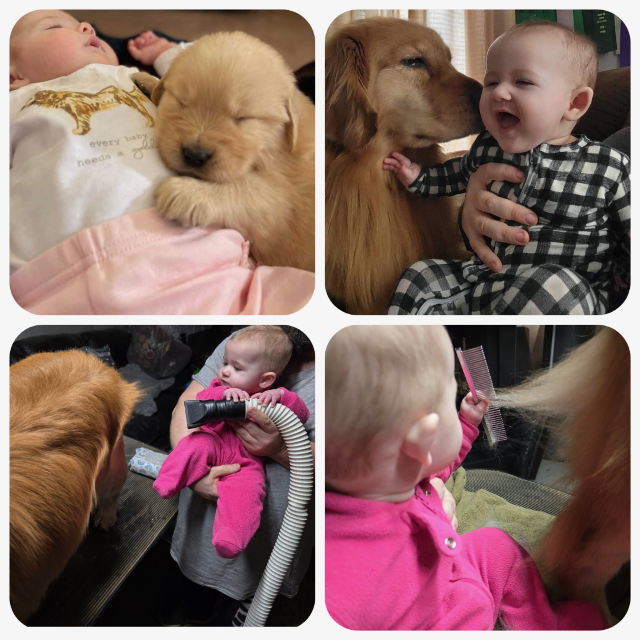 Thank you Holly Tomaso for sharing this absolutely adorable collage of photos of Evelyn, from newborn to 6 months of age, with her Golden Retrievers!