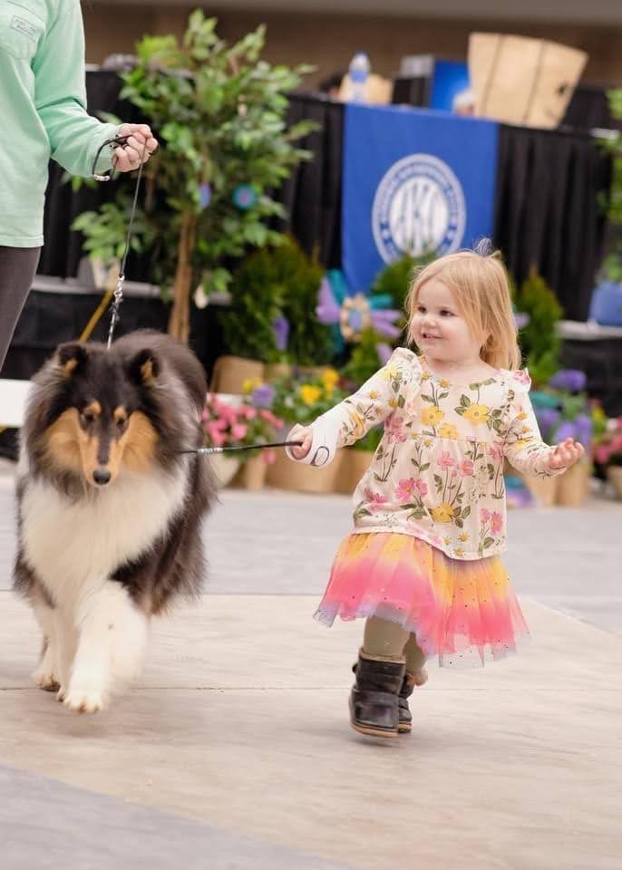 Thank you Martha Skilton for sharing this adorable photo of Evelyn, exhibiting in the Pee Wee class at the Collie Club of America with a little help from her mom, Katie Rendina! Evelyn is 3 years old!