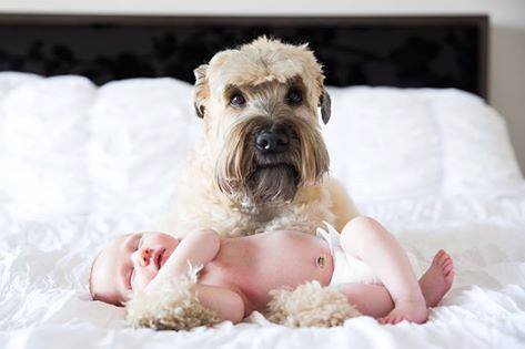 Thank you Catherine Wesley for sharing this lovely photo of Millie, a #SoftCoatedWheatenTerrier, and her brand new human sister.