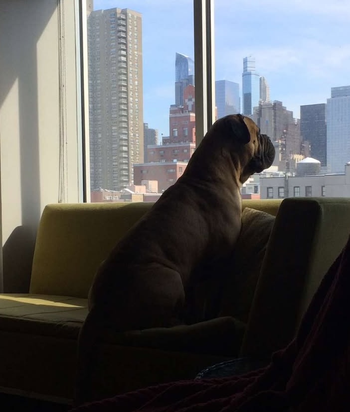 Blaine the #Bullmastiff takes in the sights of New York City from his hotel window!
